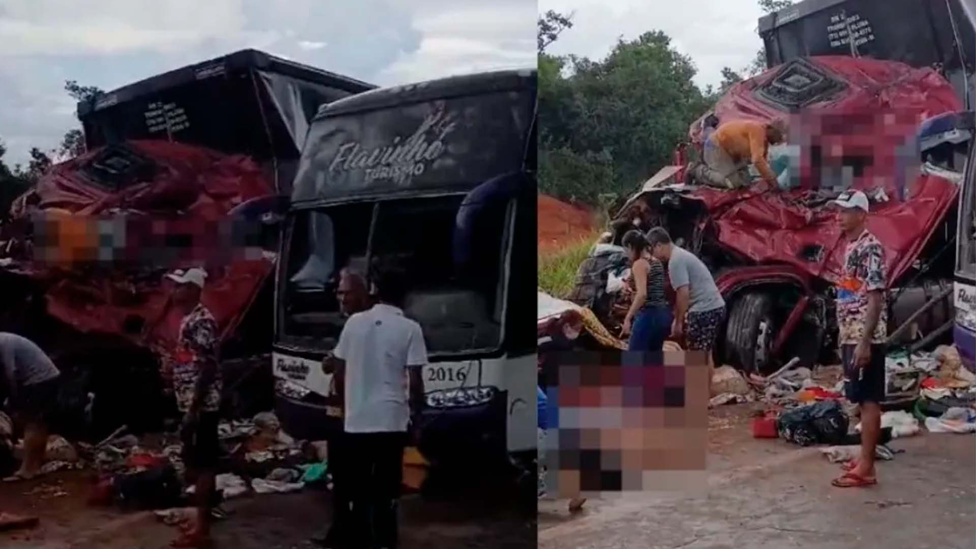 Imagens que circulam nas redes sociais mostram a gravidade do acidente. O motorista da carreta aparece preso às ferragens, enquanto vários passageiros do ônibus estão feridos e espalhados pela pista, aguardando atendimento.